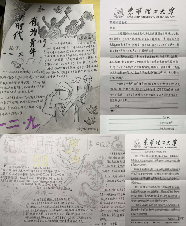 首先,班级自主开展了红色家书诵读,周颂凯同学登台诵读夏明翰的红色家书,先后诵读了致母亲陈云凤、妻子郑家钧与大姐夏明玮的三封家书,其中“别难过,别呜咽,别让子规啼血蒙了眼,别用泪水送儿别人间”“抛头颅、洒热血,明翰早已视等闲”“认定了共产主义这个为人类翻身解放造幸福的真理,就刀山敢上,火海敢闯”等字句,无华丽辞藻却字字千钧,道尽了革命先辈对家人的牵挂与对信仰的赤诚,真切懂得革命先辈并非冰冷的历史符号,而是有血有肉、重情重义的爱国先驱,他们以生命践行的信仰与担当,也为青年学子注入了源源不断的奋进力量。同期,红色感悟征集与主题手抄报创作活动同步开展,同学们既分享学习“一二·九”运动爱国主义精神的感悟与心得,也以手抄报表达爱国情怀,将鲜活的图、文及视频化作传递红色力量的鲜活纽带。