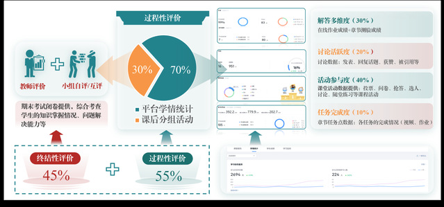 多元精准评价与多维度优化,把脉“育”的成效。依据智慧平台形成“课前学习-线上讨论-课堂活动-课后拓展-章节测验” 五维立体学情数据分析,并概化为“任务完成度、活动参与度、讨论活跃度、解答多维度”四度精准评价模式;基于知识图谱和个体能力AI精准评估,生成动态能力雷达图,实现效果评价由“经验主导的模糊判断”向“数据驱动的精准诊断”转变;聚焦“知识、能力、价值”三个目标,通过教师评价和学生自评\互评,推行“知识掌握、高阶能力、团队协作、情感态度”四个维度的多元化教学评价,塑造学生协作创新的团队合作精神和“兴水匠心”的责任担当。