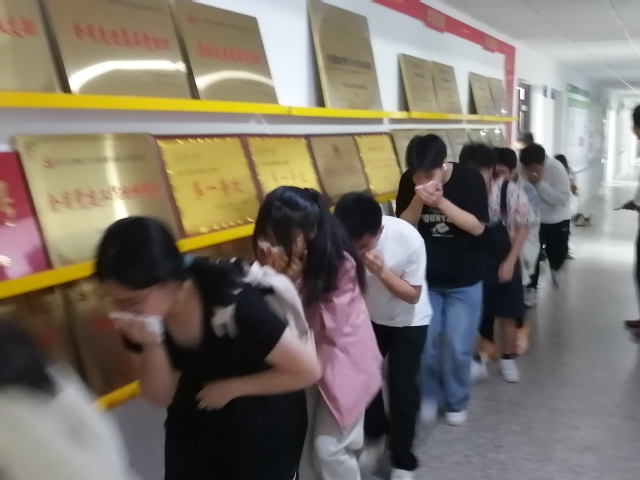 报告结束后,各班级学生代表在黄成群指导下开展了应急疏散演练活动。在发出火情警示后,学生在辅导员的引导下用衣物捂住口鼻,弯腰低姿,按照预定疏散路线有序疏散。