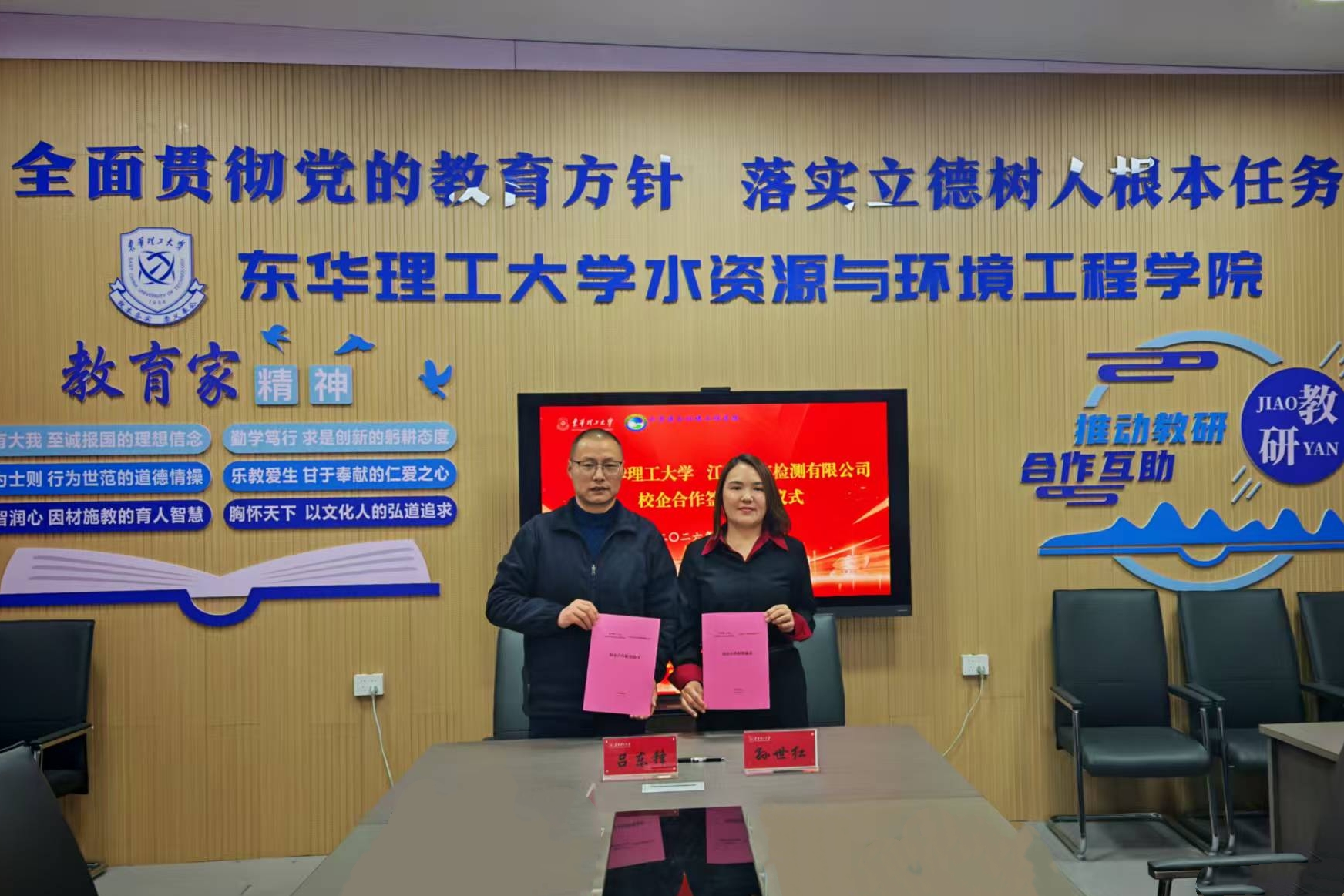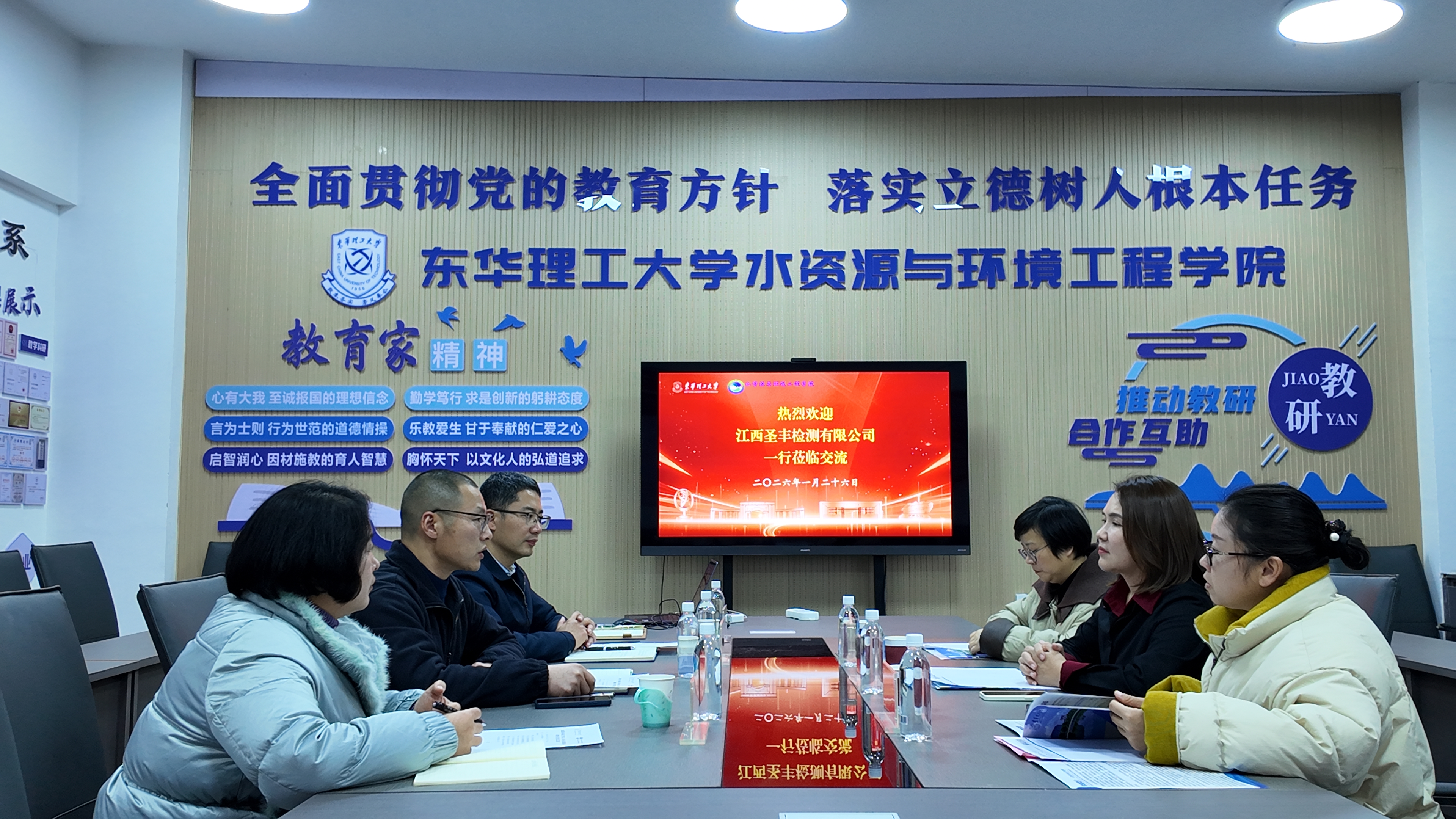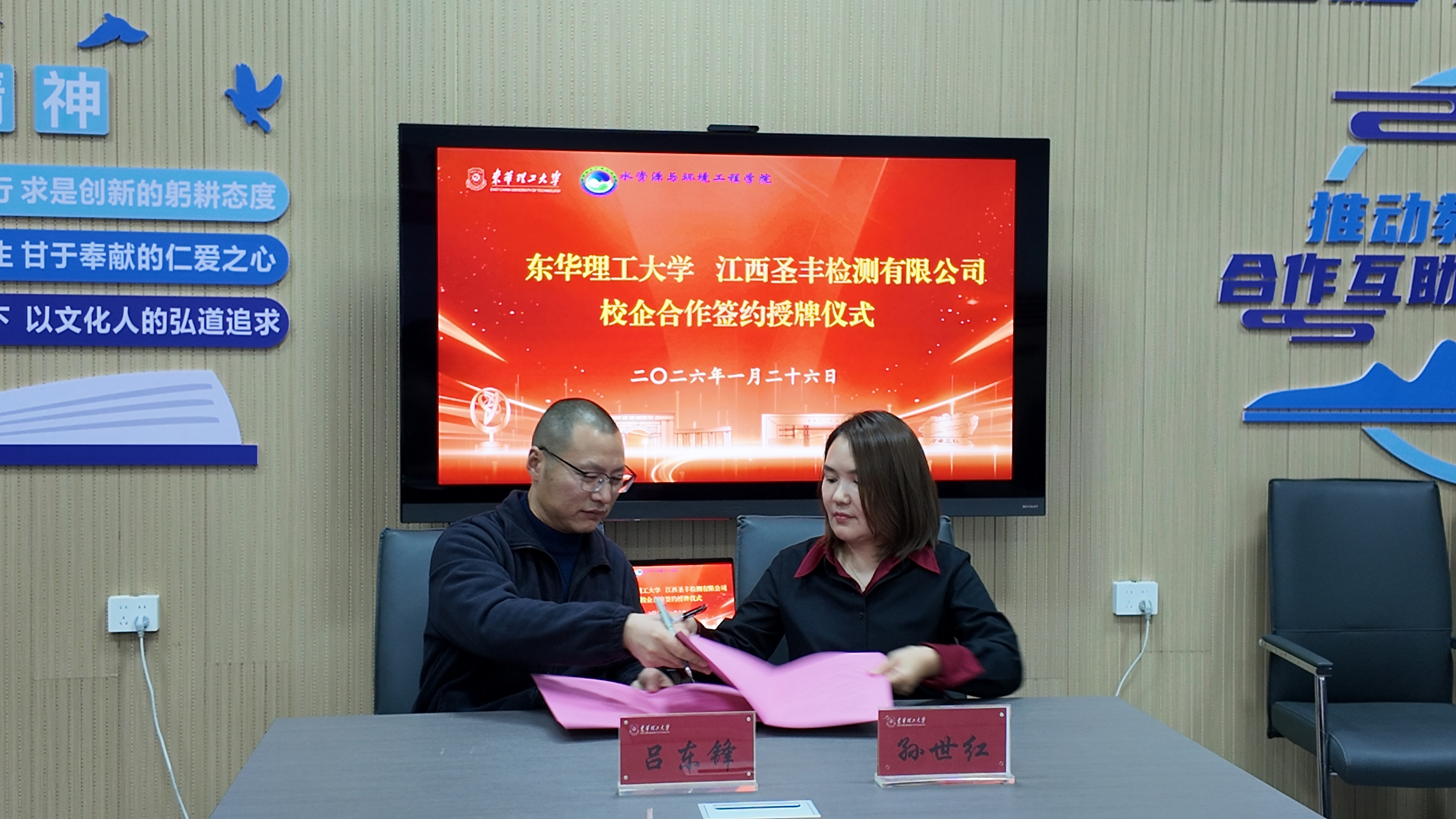 1月26日下午,水资源与环境工程学院与江西圣丰检测有限公司校企合作签约仪式在地学楼b609会议室举行。江西圣丰检测有限公司董事长孙世红、技术总监陈薇、副总经理杨婧,水资源与环境工程学院党委书记吕东锋、党委副书记王嵩、环境工程系教授陈井影及相关工作人员出席仪式。