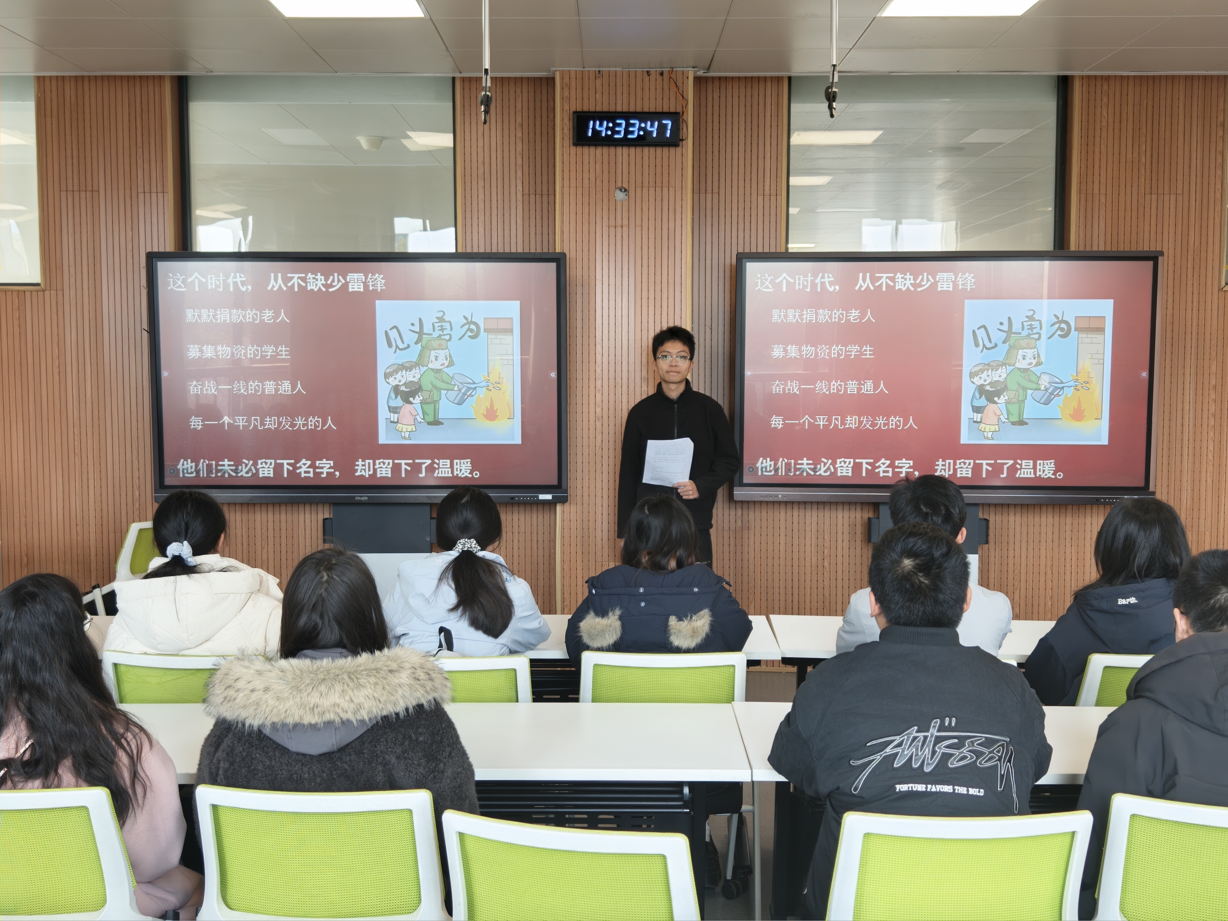 3月10日下午,学院志愿者于第四教学楼322教室开展学雷锋主题宣讲活动。活动围绕雷锋生平事迹、雷锋精神时代内涵及新时代青年践行路径展开,通过分享雷锋助人为乐、无私奉献的真实故事,让同学们深刻领悟爱岗敬业、服务他人、团结友爱的精神内核。鼓励同学们将雷锋精神融入日常,脚踏实地,成长为有理想、有责任、有作为的新时代青年。