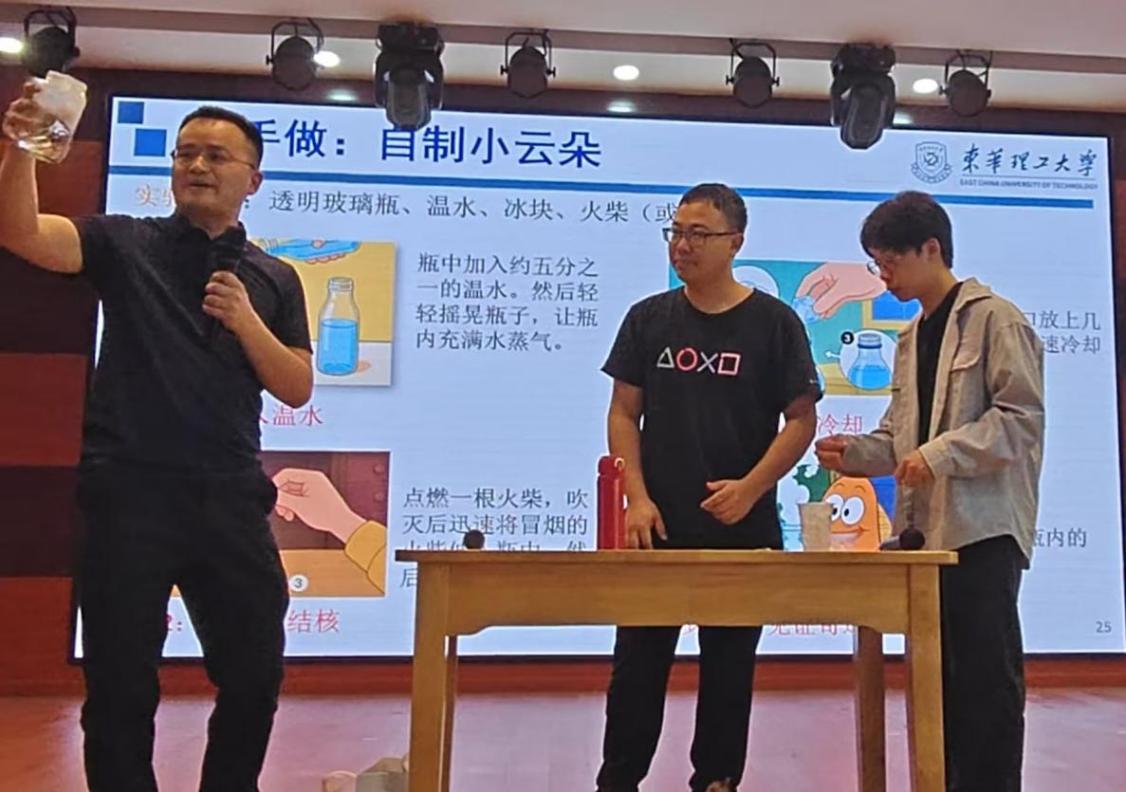 讲座中,刘诚博士以卫星云图为切入点,用通俗易懂的语言拆解大气物理原理,系统讲解云的形成机制。他结合“太阳加热”“空气运动”等趣味知识点,清晰呈现水汽蒸发、上升、冷却、凝结的完整过程,将抽象科学知识转化为生动易懂的内容。为让科学直观可感,刘诚博士现场演示“瓶中造云”实验。通过温水、凝结核、冰块模拟云的生成条件,透明容器内瞬间升腾起白色云雾,直观展现自然气象原理,赢得在场师生阵阵惊叹。讲座还通过高清云图展示积云、卷云等各类云态特征,并设置互动问答环节,同学们踊跃提问、积极交流,现场氛围热烈。