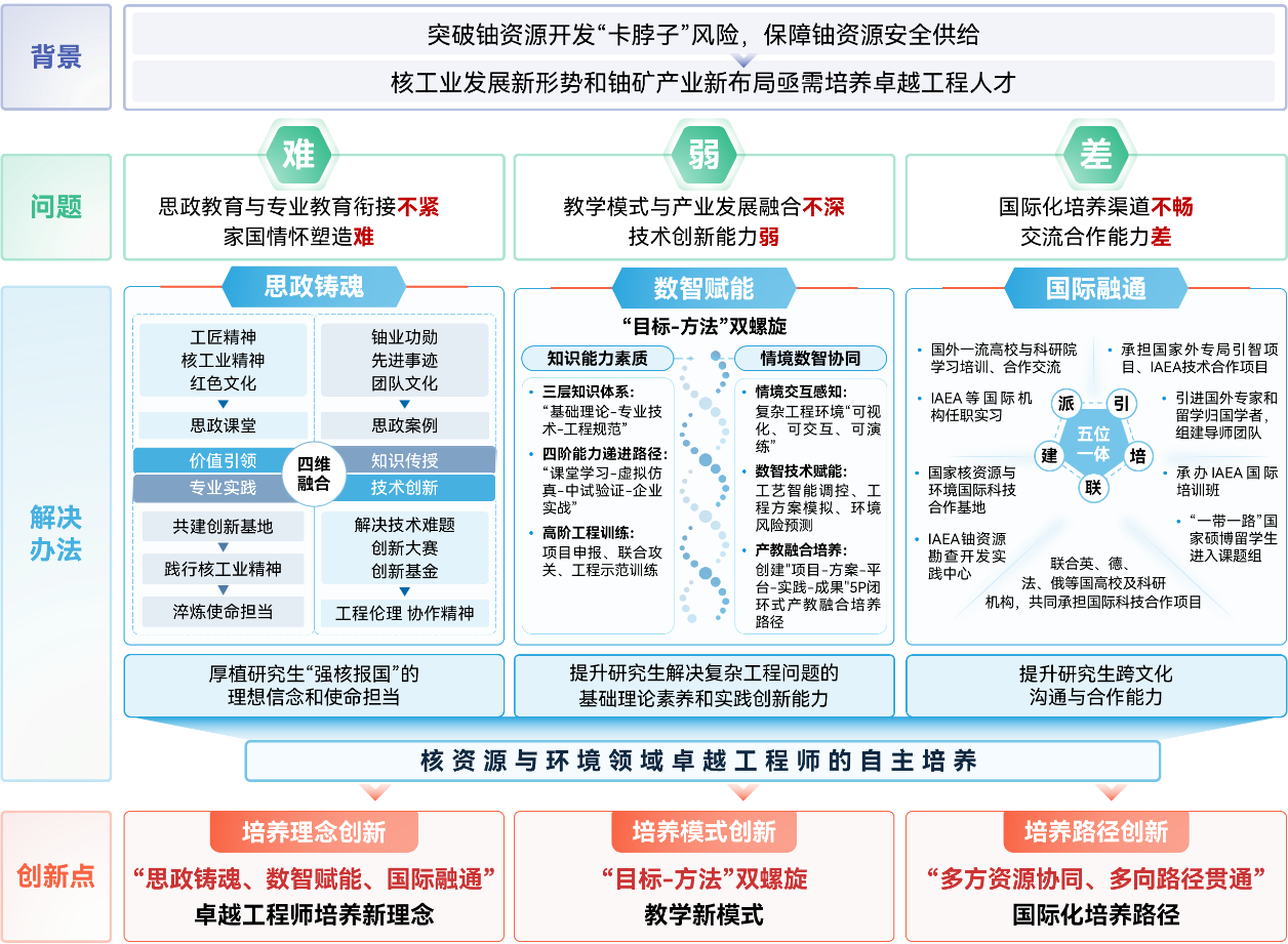 铀是核工业的“粮食”,是国家安全的重要基石。21世纪以来,我国铀矿产业布局逐步从南方传统产区向西北战略基地及海外市场拓展,面临核工业产业升级、布局调整和技术迭代发展新形势,迫切需要培养具有广博的国际视野与交流能力、突出的创新与攻坚能力和深厚的家国情怀与使命担当的卓越工程人才,以适应核资源与环境产业发展的需求。