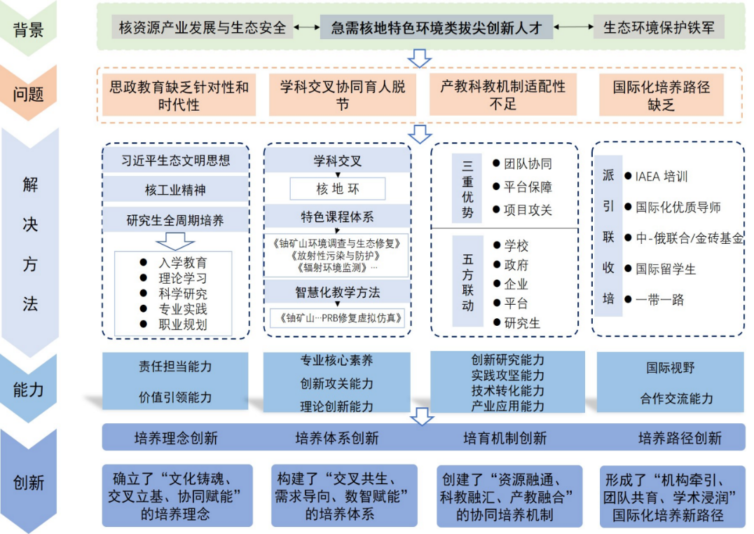 铀矿是“核工业粮食”,其绿色开发是国家生态文明建设和战略资源安全重要保障。21世纪以来,我国铀矿产业布局逐步从南方传统产区向西北战略基地及海外市场拓展,迫切需要培养能扎根边疆、兼具核地科技素养与生态治理能力的环境类拔尖创新人才,适应核资源产业发展的需求。习近平总书记提出要建设一支“政治强、本领高、作风硬、敢担当,特别能吃苦、特别能战斗、特别能奉献”的生态环境保护铁军,为培养环境拔尖人才指明了方向。