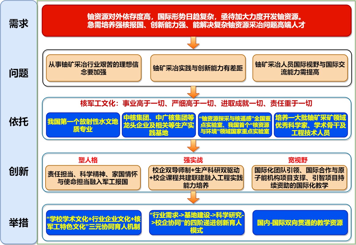 东华理工大学(原华东地质学院)自1956年创办以来,一直肩负着我国铀矿勘查与铀资源开发专业人才培养任务,已成为全国国防教育特色学校,被誉为“中国核地学人才摇篮”和“世界原子能事业的宝贵财富”。经过13年的教学探索和实践,构建了“三元协同、四阶递进、双向贯通”铀资源开发领域研究生培养模式。